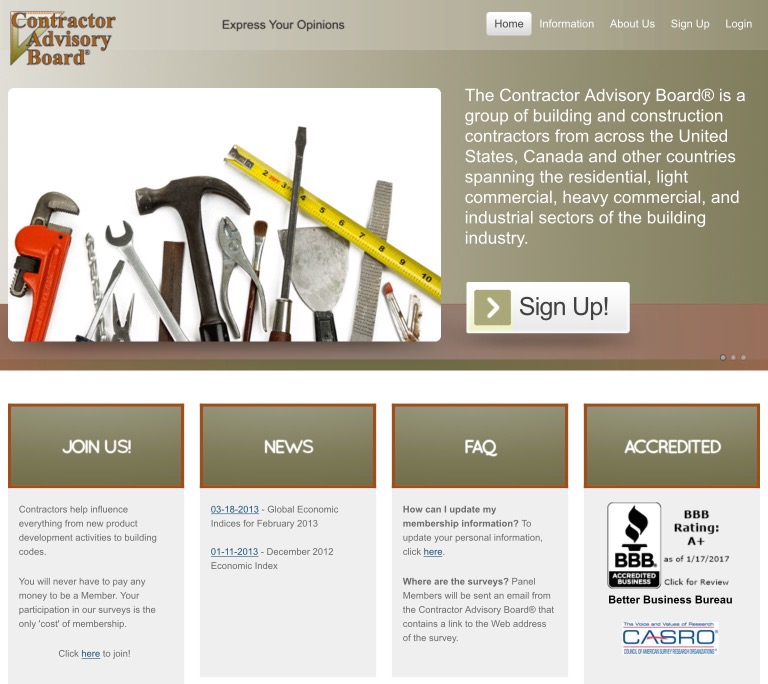 Membership in the Contractor Advisory Board is free. You will never have to pay any money to be a Member. Your participation in their surveys is the only “cost” of Membership.