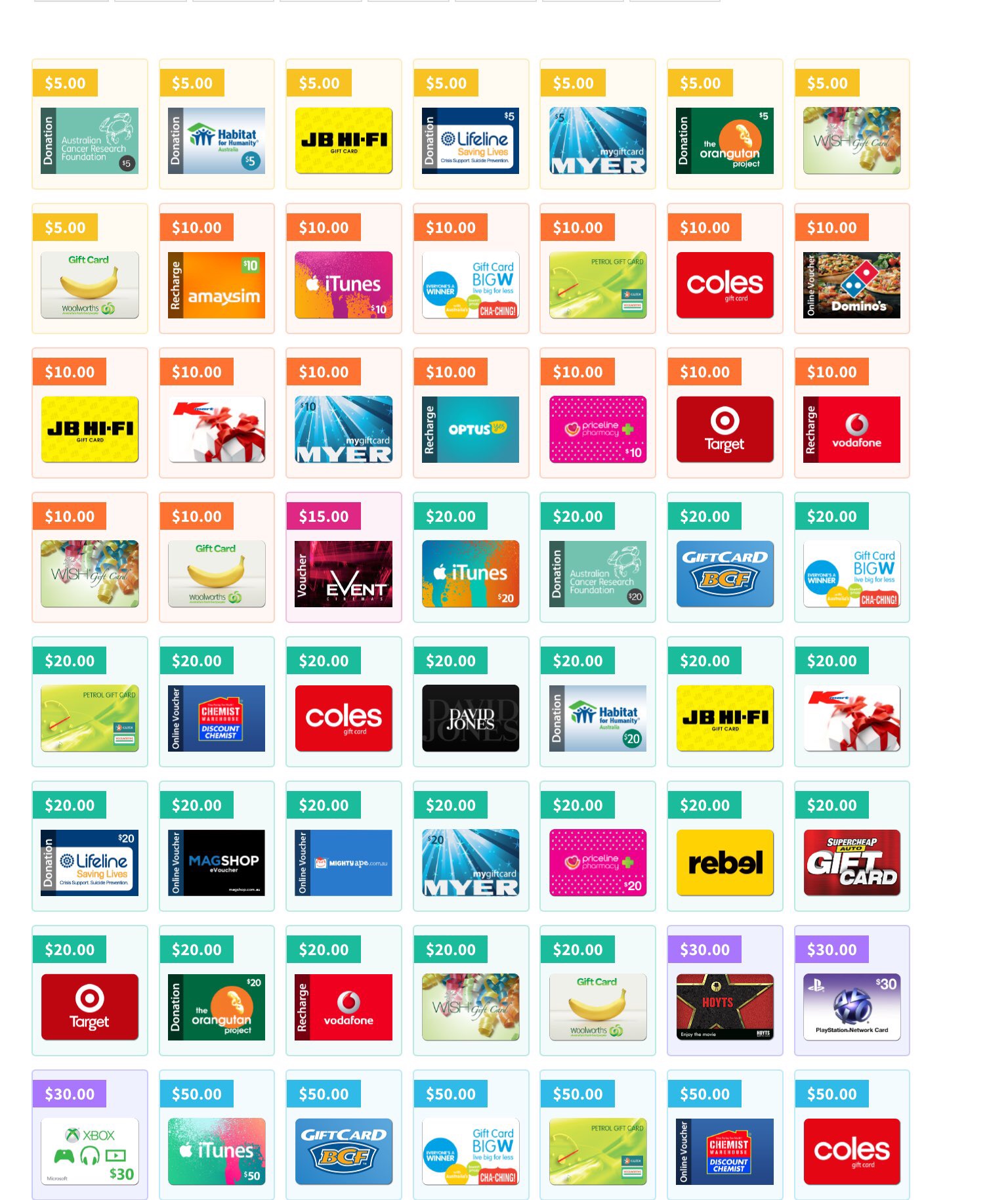 The full list of GiftPay Cards/Vouchers and their values available can be found here: GiftPay Rewards: