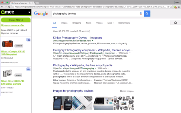 You can get cash rewards when you’re searching on your favorite sites and engaging with brands you love. You can also get price savings when we find you a better deal with our automatic price comparison tool – all without having to go to different sites to compare, as well as coupons and deals. These appear as additional results on the left of your screen in the Qmee sidebar, on the sites you’re already searching on. Just click on the results that interest you to earn cash or save money.