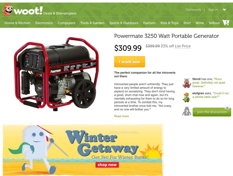And Woot, Inc. sells the merchandise and pays for the gas. The aforementioned websites, of which Woot.com is the alpha URL, specialize in great new deals every day. They encourage (almost) unfiltered community discussion about that cheap stuff, starting with our own outrageous product descriptions.