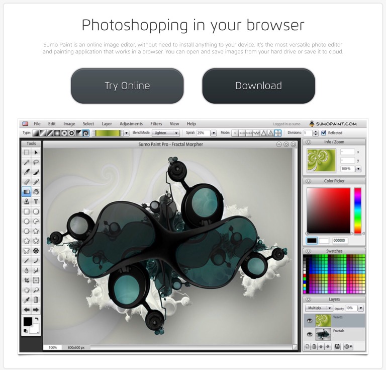 Sumopaint.com is an online image editor where users do not need to install any software on their device. It is seen as one of the most versatile photo editor and painting application that works in a browser. Users can save their images from their hard drive or to cloud after editing them.